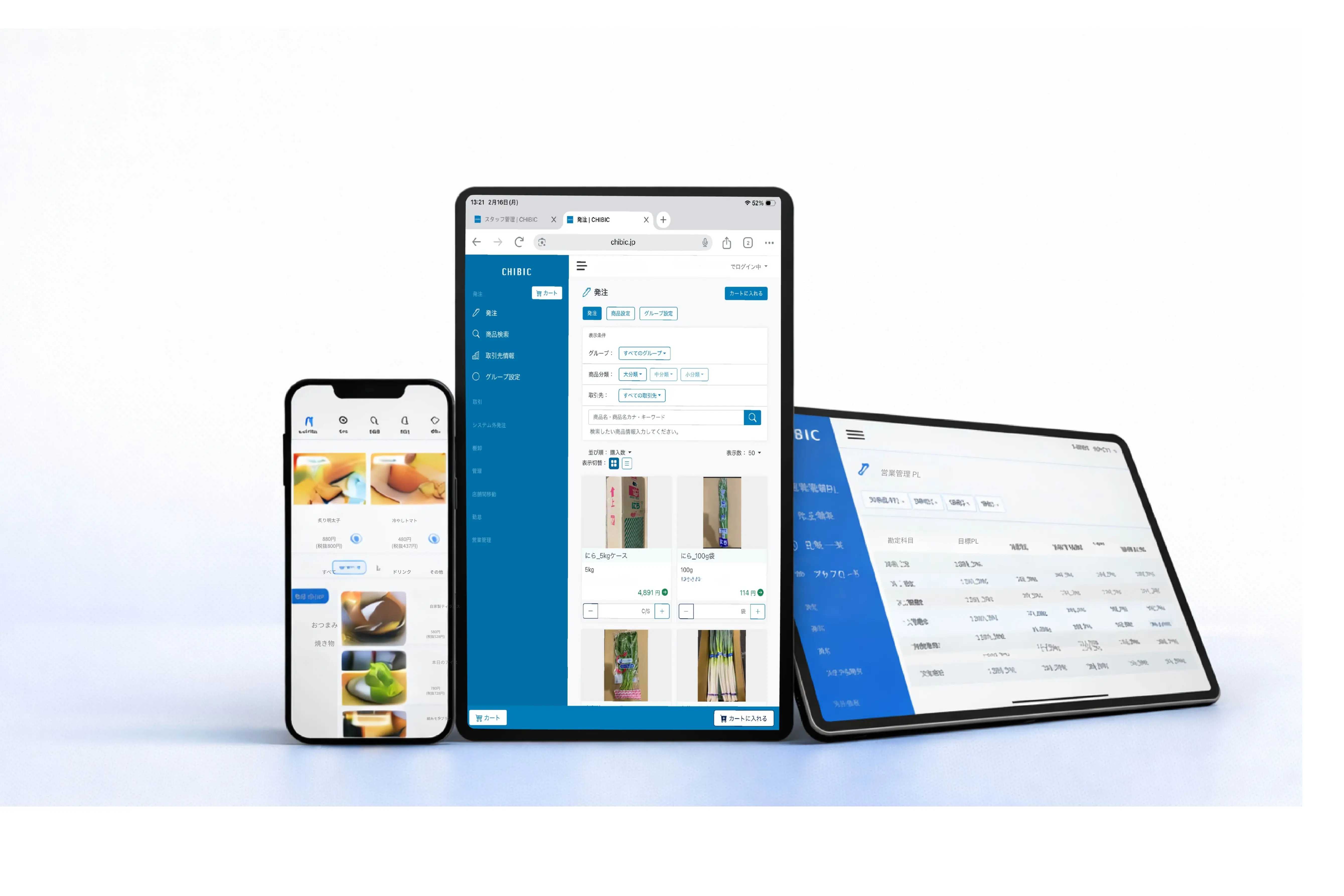 受発注・勤怠管理・POSレジ・予約管理・営業管理・シフト管理、他システムとの連携などCHIBICシステム1つに集約されています。